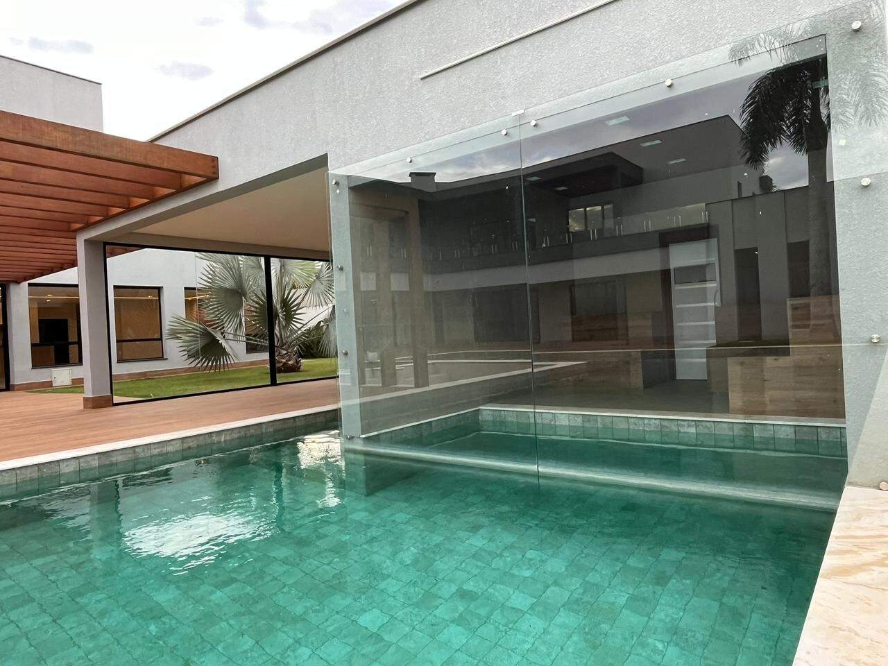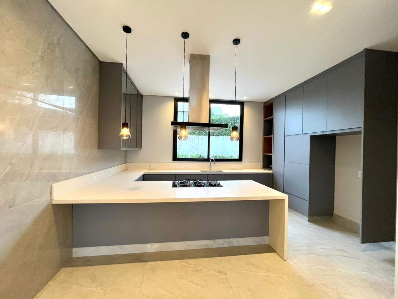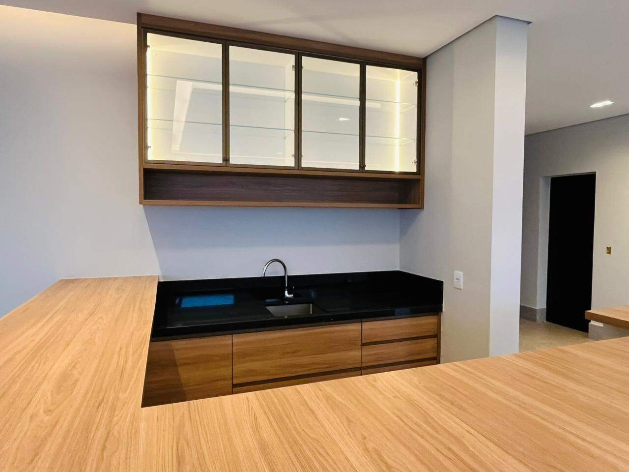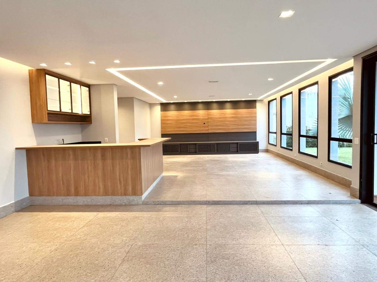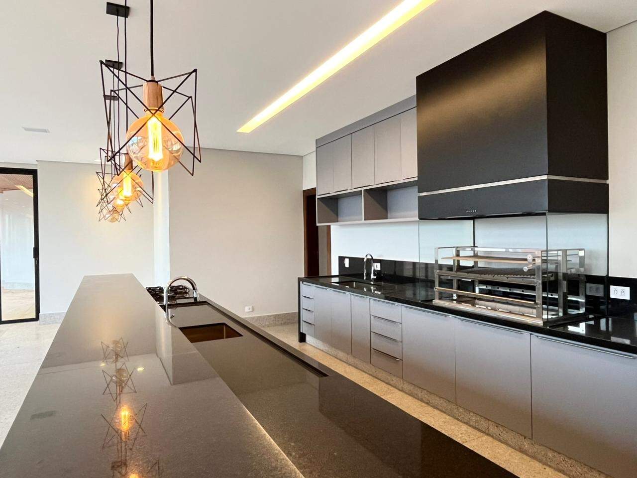 A cozinha — totalmente planejada — conversa com a área gourmet, que mais parece um salão de festas privado, com bar, adega, espaço TV e integração total com a piscina aquecida.
