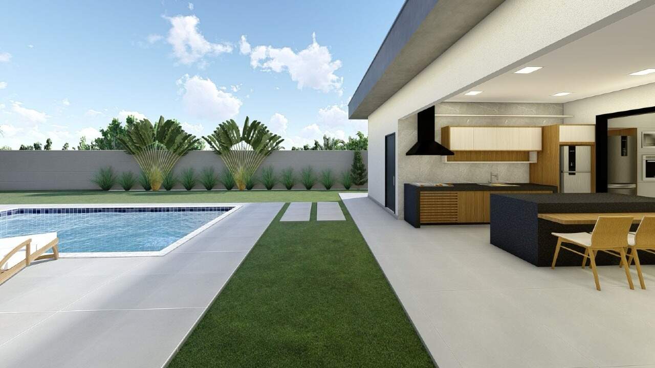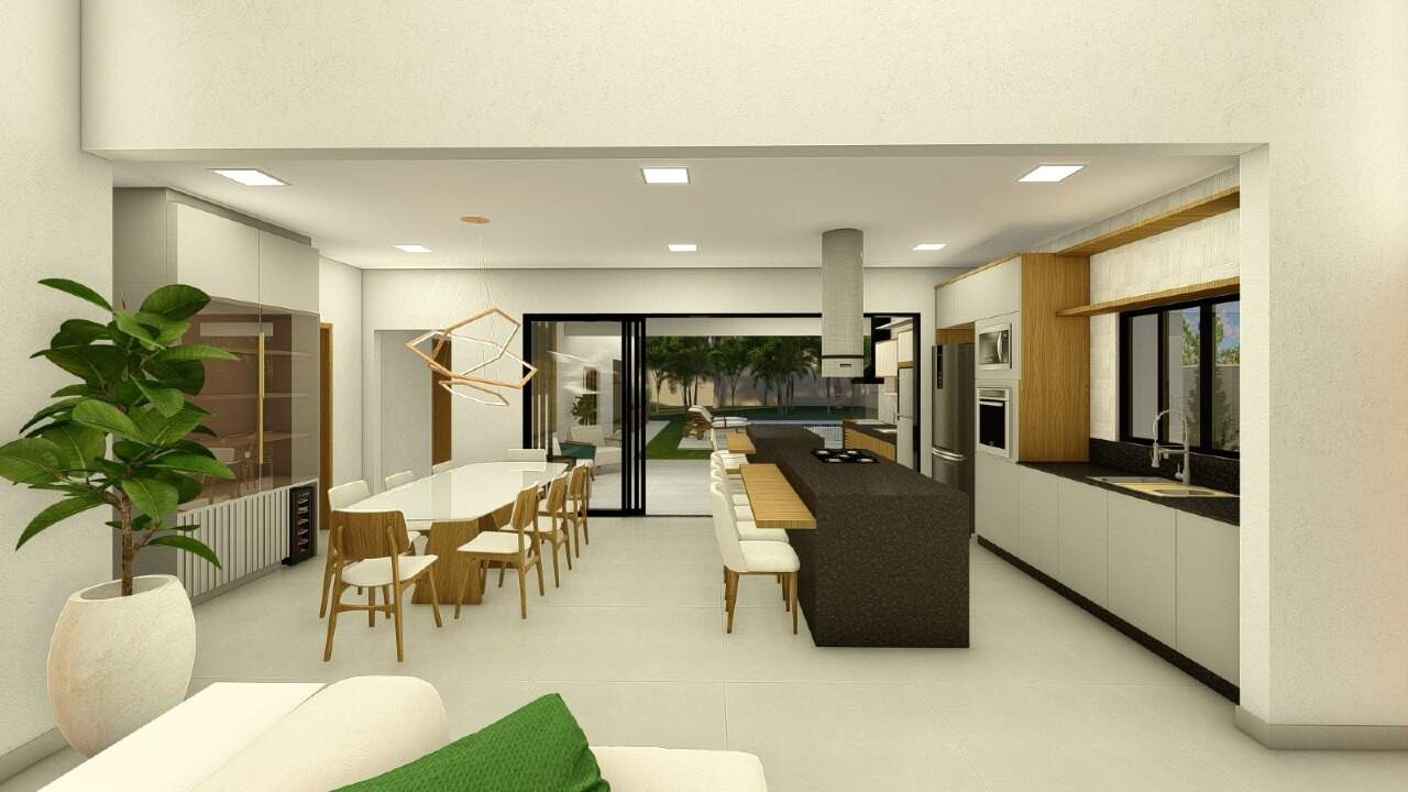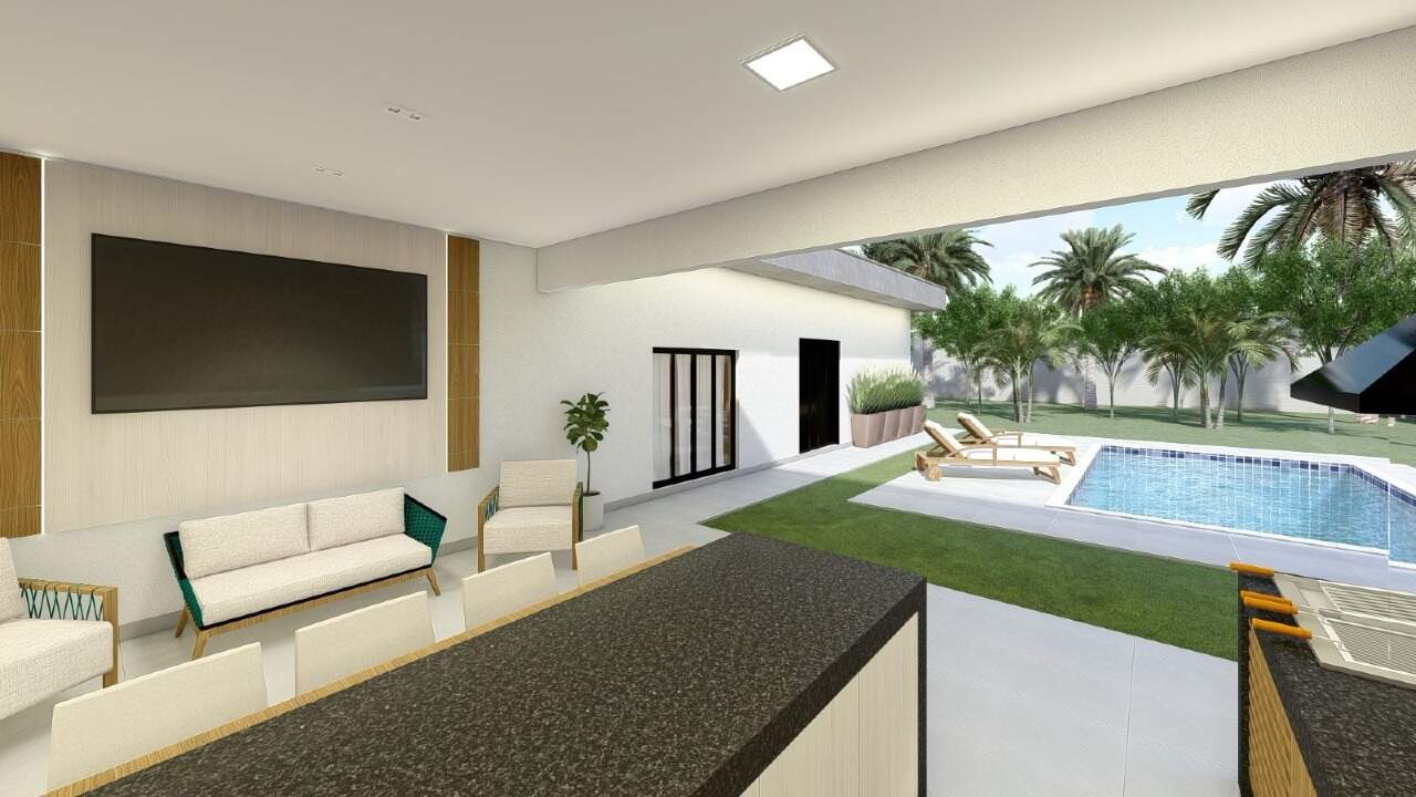Na parte social interna contempla uma sala de TV e Jantar integradas com pé direito de 4,5m, cozinha com ilha e integrada com a churrasqueira que também contém uma com ilha, dispensa, lavanderia, banheiro individual somente para a piscina , jardim externo ao lado da piscina,depósito
