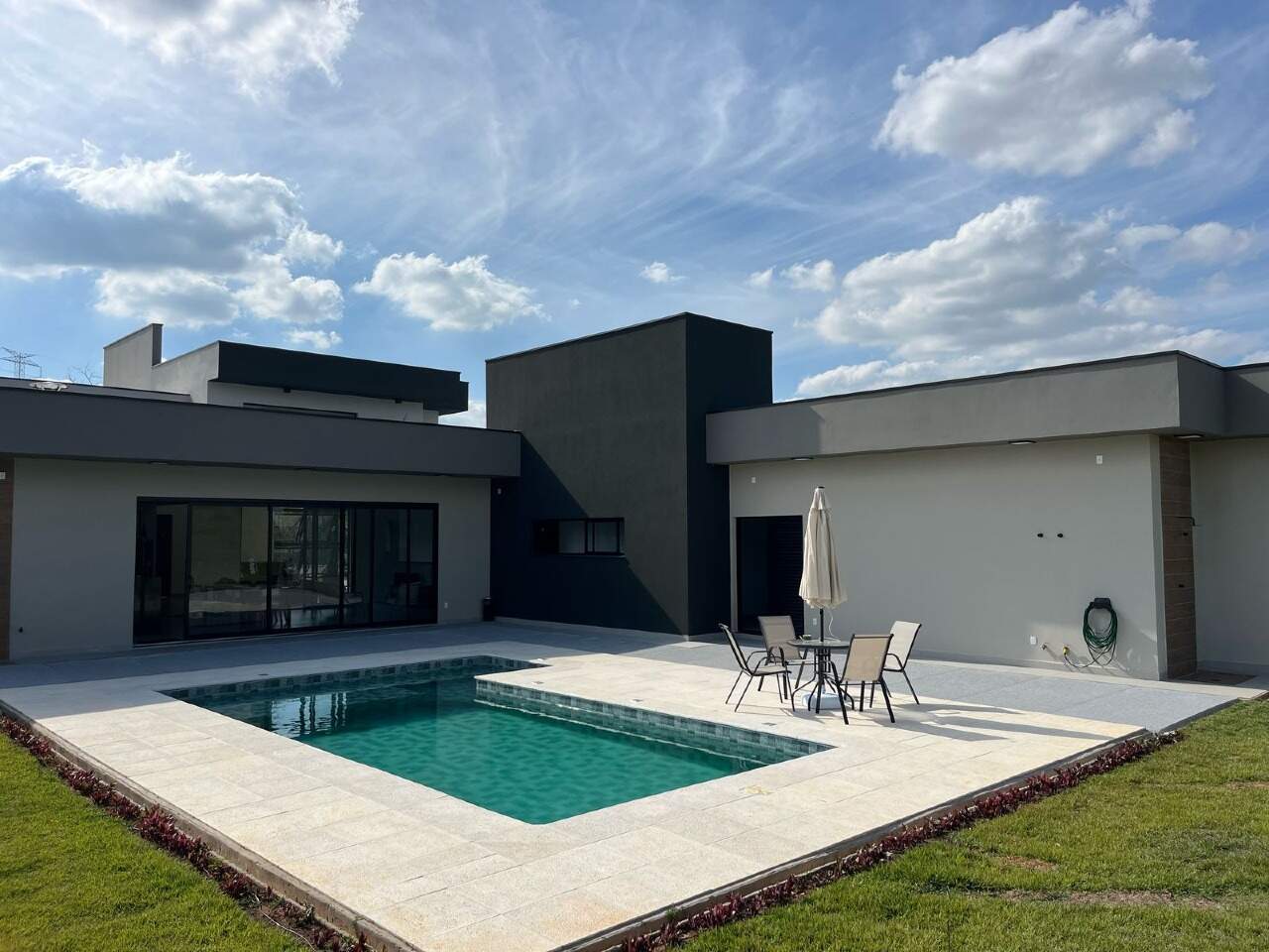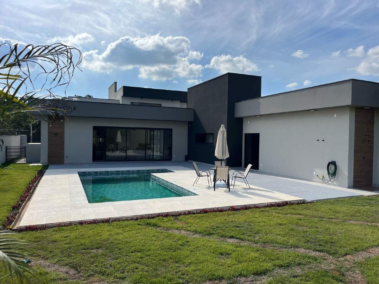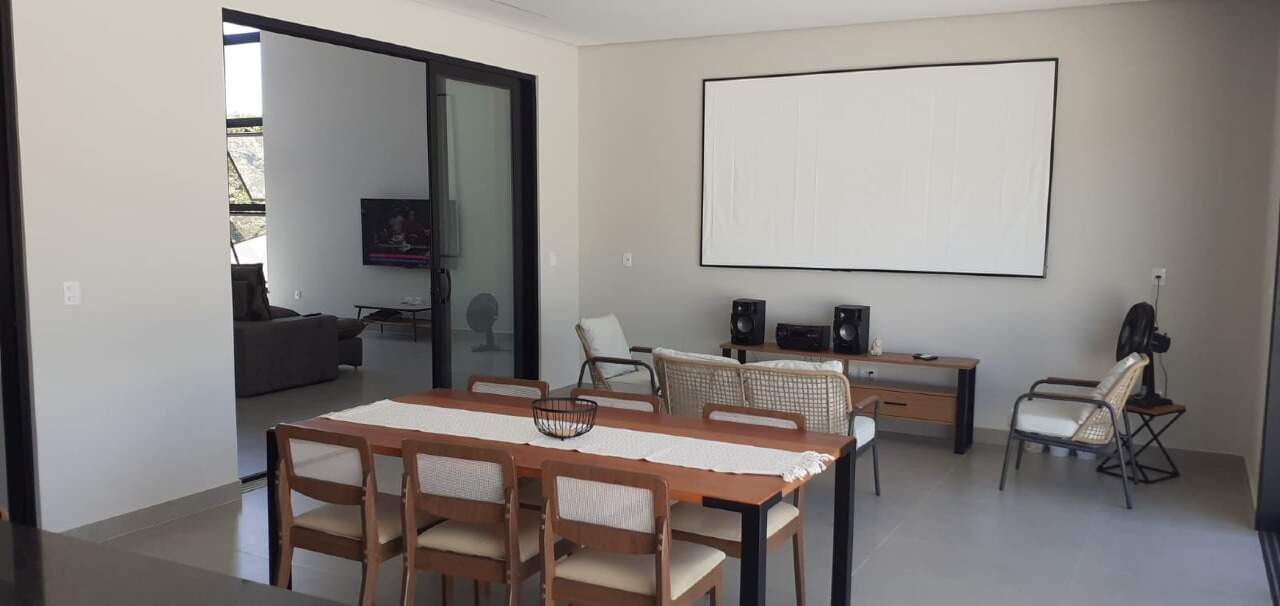 Na parte social interna contempla uma sala de TV e Jantar integradas com pé direito duplo, cozinha com ilha e integrada com a churrasqueira, dispensa, lavanderia, banheiro individual somente para a piscina e na parte de lazer externa para relaxar há ainda piscina.