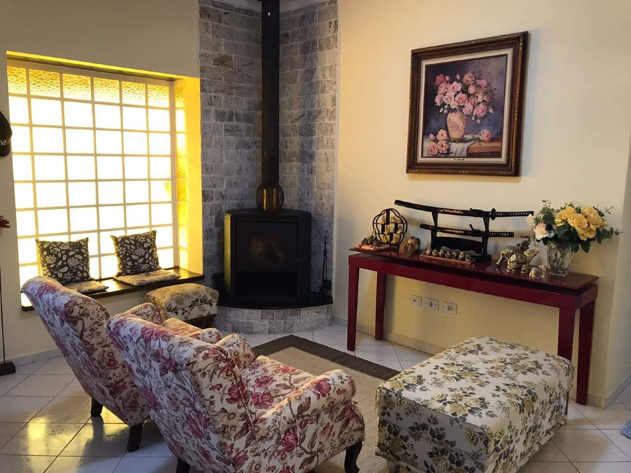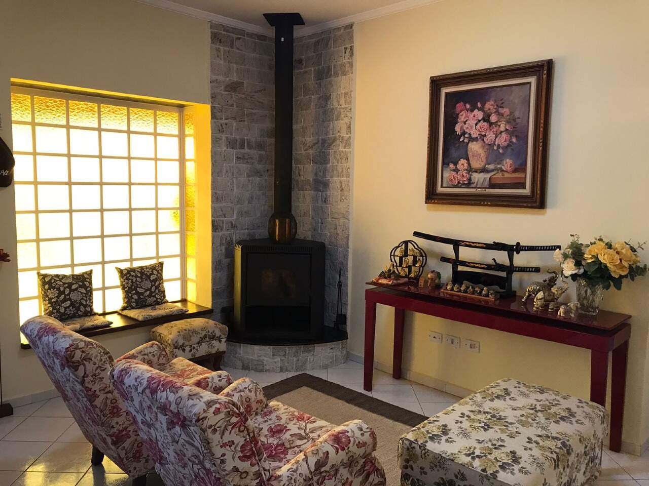 Sala com lareira estilo alemão, oferecendo acolhimento em dias mais frios.