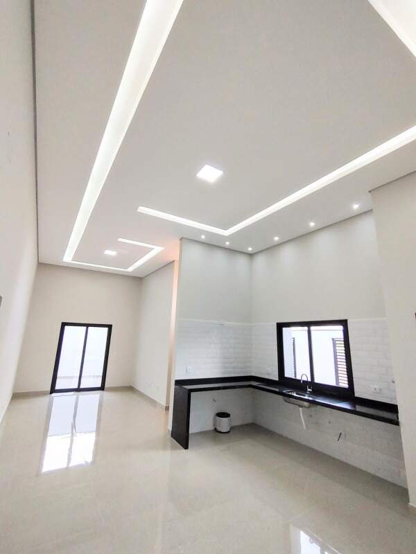 Ainda falando do espaço interno, essa casa possui sala com cozinha integrada e pé direito alto, sanca fechada com spots e luminária dividindo o ambiente, uma área gourmet ampla com churrasqueira com um quintal enorme que comporta uma área de piscina e jardim.
